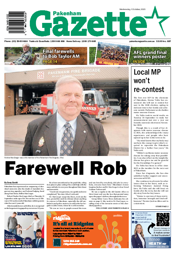 Pakenham Gazette – 1st October 2025 Subscribe or Login to see the rest of the content. Username Password * Remember Me Forgot Password News Lang Lang ready to restart a heart 11/10/2025 Lang Lang and Kingsville are now well equipped to help save the life of someone in cardiac arrest – the towns graduating this month... Battle of the bands rocks Cardinia 11/10/2025 The inaugural Cardinia Inter-School Battle of the Bands was a rocking success with three schools and more than 60 students showcasing their talents. Held at... Five key tips for silage this season 11/10/2025 Capitalising on the spring surplus will be critical on farms this year. While some things are out of our control, focusing on key...