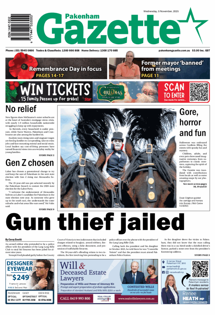 Pakenham Gazette – 5th November 2025 Subscribe or Login to see the rest of the content. Username Password * Remember Me Forgot Password News Heartbroken owner loses kitten despite heroic efforts to save him 09/11/2025 Benji the kitten, who only one week ago was fighting for his life at an emergency clinic has sadly passed away at his home... Residents stranded without buses for months 09/11/2025 Residents say they’ve been left stranded, with no public bus services operating in some parts of Pakenham for more than three months. On Cameron Way,... End of term for State monitors appointed to oversee Casey Council 09/11/2025 The City of Casey has bid farewell to the State Government Municipal Monitors, who were appointed a 12-month term to provide oversight on the...