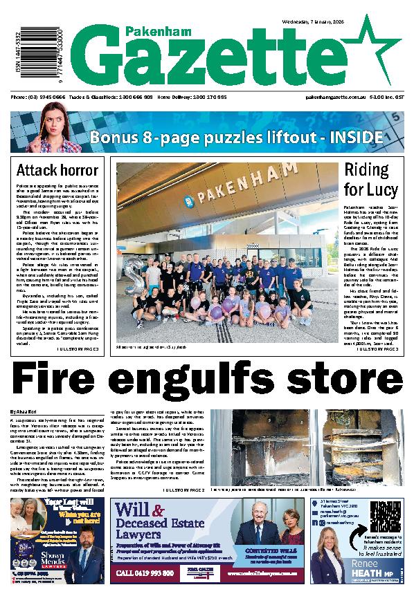 Pakenham Gazette – 7th January 2026 Subscribe or Login to see the rest of the content. Username Password * Remember Me Forgot Password News Power surge with eight inclusions 29/01/2026 The 2026 Vic Country and Metro summer training squads were recently announced and Gippsland Power was the best represented Talent League club with eight... Brilliant Bulls back together 29/01/2026 It was a special day down at Greaves Reserve on the weekend as Dandenong West welcomed back many past premiership players and their partners... Robb Evans is Cardinia Shire’s 2026 Citizen of the Year 29/01/2026 An honour born of tragedy, Pakenham resident Robb Evans has been named Cardinia Citizen of the Year for his ongoing support of young people...