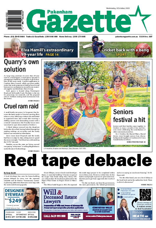 Pakenham Gazette – 8th October 2025 Subscribe or Login to see the rest of the content. Username Password * Remember Me Forgot Password News Lang Lang ready to restart a heart 11/10/2025 Lang Lang and Kingsville are now well equipped to help save the life of someone in cardiac arrest – the towns graduating this month... Battle of the bands rocks Cardinia 11/10/2025 The inaugural Cardinia Inter-School Battle of the Bands was a rocking success with three schools and more than 60 students showcasing their talents. Held at... Five key tips for silage this season 11/10/2025 Capitalising on the spring surplus will be critical on farms this year. While some things are out of our control, focusing on key...