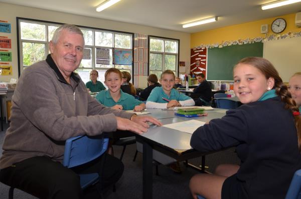 Pakenham RSL president Gary Elliot meets with one of the classes at Cardinia Primary School. Students are Jack, Caitlyn, Charli and Clair. 129553_03 Picture: DONNA OATES