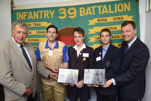Alan Jameson from the 39th Battalion Association, David Howell from the Kokoda Association with award-winners Jake Templar and Ashley Ray alongside Minister Edward O'Donohue. 132234_01 Picture: ROB CAREW