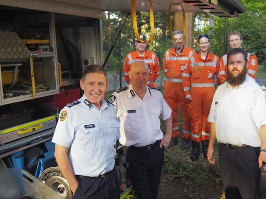 Emergency Management Commissioner Craig Lapsley, SES Chief Officer Trevor White with Emerald Unit Controller Ben Owen inspecting the new truck as other members look on. 147051_01 Picture: COURTESY DALE FRANKLAND