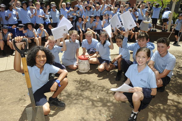 Berwick Primary School students Andre, Cody, Maci, Eden, Chesea, Matt, Alex, Kaleb,and Madeline unearth the time capsule. 148510 Picture: STEWART CHAMBERS
