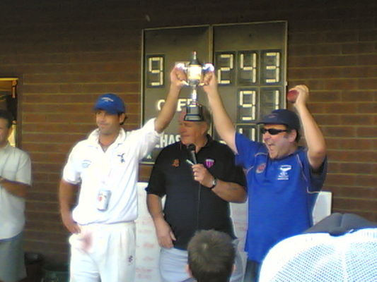Club president Silvio Marinelli celebrates a Cranbourne premiership with Ross Woodall.