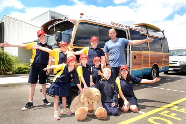 Brad Nash, rear right, with the Bus and Officer Specialist School students, from left, Duncan, Lachlan, Matilda, Olivia, Annabelle, Jordyn, Cameron and Kara. 149438 Picture: ROB CAREW