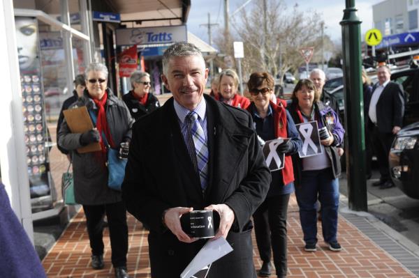 Brian Paynter leads Pakenham Inner Wheel Club members on a five cent drive down Main Street back in 2014 in an effort to raise money and awareness of violence against women on the first anniversary of the murder of his friend Kylie Blackwood in her home.