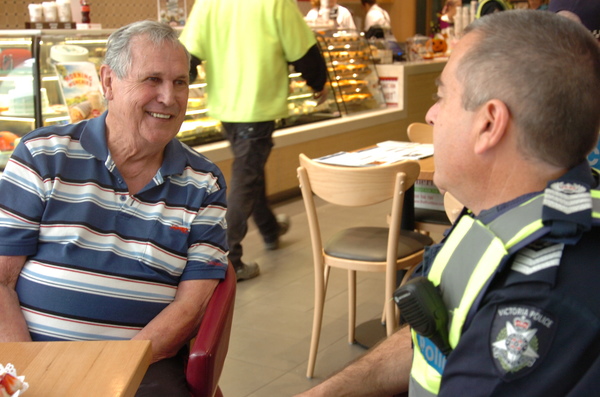 Pakenham Seniors Citizens president Michael Wall talking with Pakenham Senior Sergeant Nathan Prowd.
