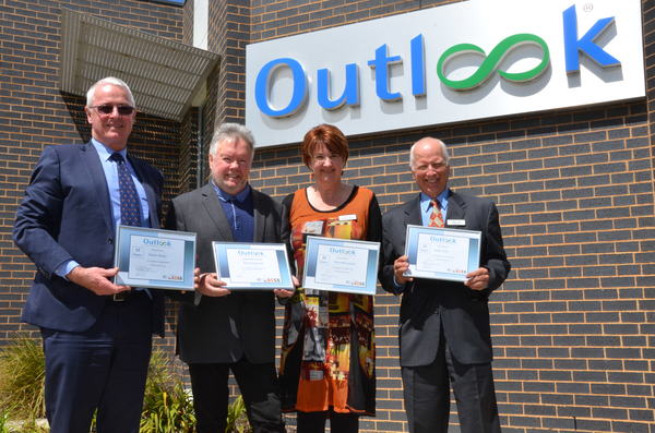 Recognised for their long service to Outlook are, from left, board chairman Edwin Hume, new life governor Tony Fitzgerald, interim CEO Anne McCormick and treasurer Peter Link.
