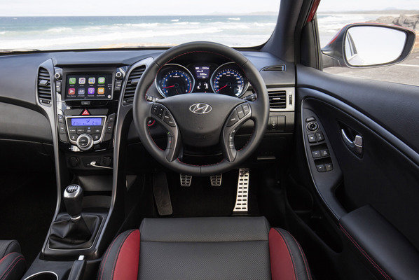 The i30 Series II SR range now features an upgraded sports interior, with black leather upholstery, red inserts on seat bolsters, and red stitching on the seats, steering wheel, and front door armrests.