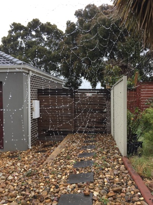 An orb spider web was found in Lakeside, dotted with water droplets.