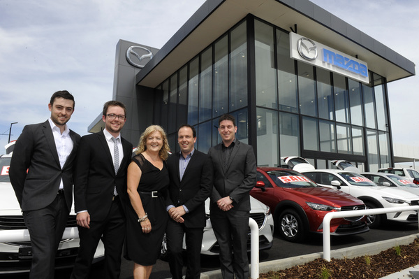 The Clough family celebrates the opening of the new Pakenham Mazda dealership, from left, Zac, Ben, mum Sue, Paul and Kane. Picture: STEWART CHAMBERS 163061