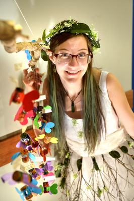 Alex Lloyd modelling wearable art by artist Barbara Owen called Forest Nymph beside another recycled artwork by Amber Trotter called Kaleidoscope of Colour. 168683_01 Picture: ROB CAREW