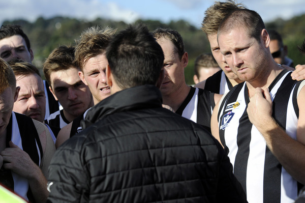 After a stunning opening blitz, Narre Warren coach Heath Black had the full attention of his players at quarter time. 170569 Pictures: STEWART CHAMBERS