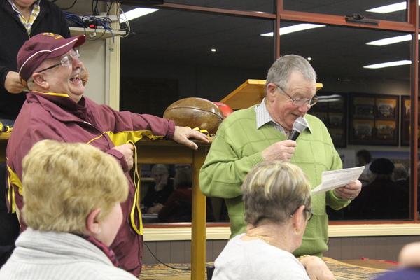 1967 reserves premiership player John Atkins, right, had club president Chris Soumilas in stitches on Saturday night as the Hawks celebrated their premiership reunions from 50 years ago. 170668 Pictures: RUSSELL BENNETT