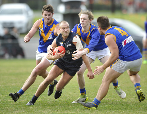 Berwick skipper Madi Andrews was typically determined on Saturday, taking on Cranbourne’s Shaun Marusic, Nick Derbyshire and Max Gearon during the second semi-final at Pakenham. 172397 Pictures: ROB CAREW