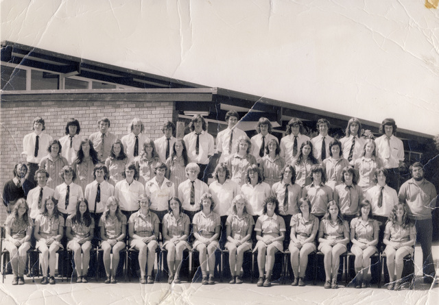 The Form 6 class from 1975. Back row Dale Jackman, Greg Hewson, Phil Macreadie, Rod Collins, Ian Hanke, John Fitzpatrick, Ian Van Velsen, Peter Bowman, John Fennell, Alan Dunstan, Len Van Der Velde, Greg Wyatt. Third row Angie Villani, Anette Murtagh, Anne Jensen, Judy Whiteside, Carolyn Smith, Christi Lauritsen, Raelene Sharpe, Julie McLeod, Mary Walsh, Nicky Trainer. Second row Neville Reimers (teacher), Russell Polson, Peter Streader, Andrew Barclay, Tim White, Jurgen Schaeffer, Mark Collins, Greig Neilson, Geoff Symons, Clinton Smith, Greg Studd, Robert Williams, Alan Newton, Don Paproth (teacher). Front row Arlene Robb, Helen Irving, Sue McPhee, Ann Willems, Carol Claflin, Robyn Monckton, Alison Chatfield, Sandra Tempest, Kerry Byrne, Marryanne Van Diepen, Jenny Ingamells, Debbie Wray and Kay O’Donahoo.