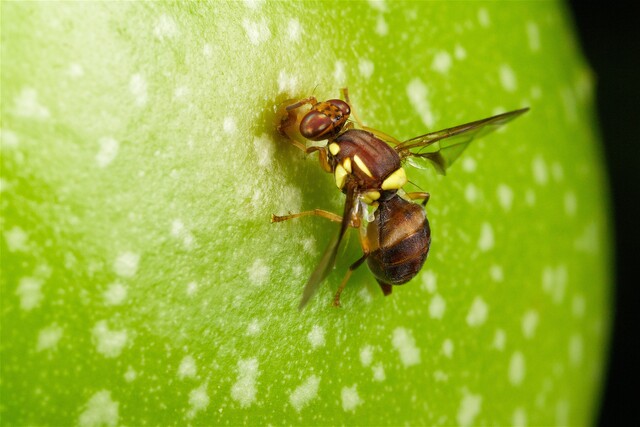 Pick all ripe or ripening fruit and process it to use the unaffected parts, and freeze or boil any suspected infested fruit or scraps. Do not compost.