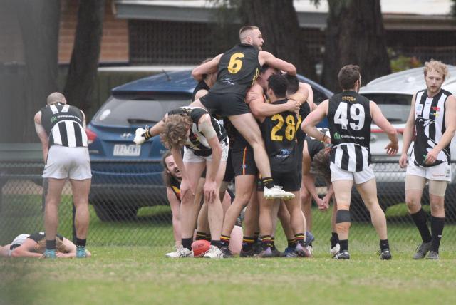 Hallam’s Josh Anderson falls to his knees as the siren rings out at Hallam Recreation Reserve. Matthew Melrose joins him […]