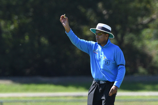Umpires seek a replacement for a shattered bail in Narre North's clash with Lynbrook.