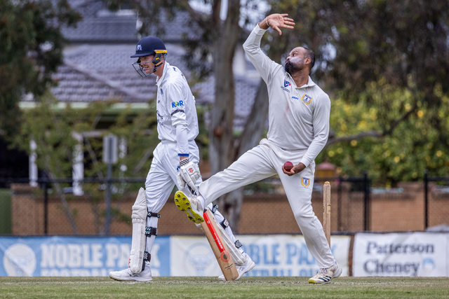 Sahan Perera sends one down during his four-wicket spell for Noble Park on Saturday. (Gary Sissons: 519204)