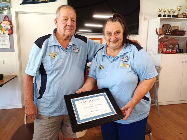 Peter and Pauline McWilliams were presented with a certificate and life membership badges on the last day of the 2025 bowling season. (Supplied: 526024)